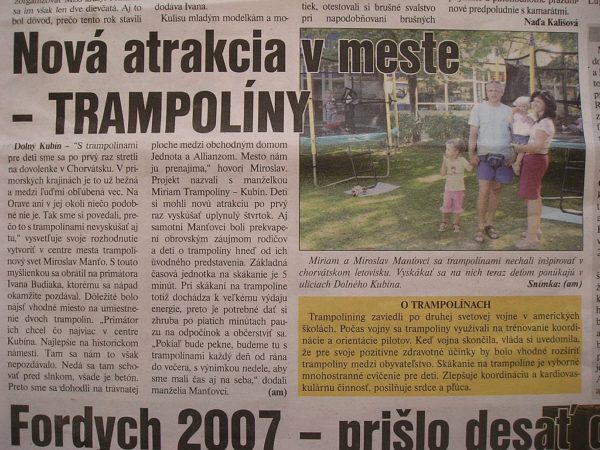 2007 – postavili sme prvé trampolíny pre verejnosť na Orave, skákali malí aj veľkí. So súhlasom vtedajšieho primátora sme deťom priamo v meste robili radosť celý august. Každý deň ráno trampolíny postaviť a na večer skladať, ale stálo to za to pre tie rozžiarené detské očká. Tieto detské atrakcie, potešili deti aj v septembri, aj keď počasie bolo…